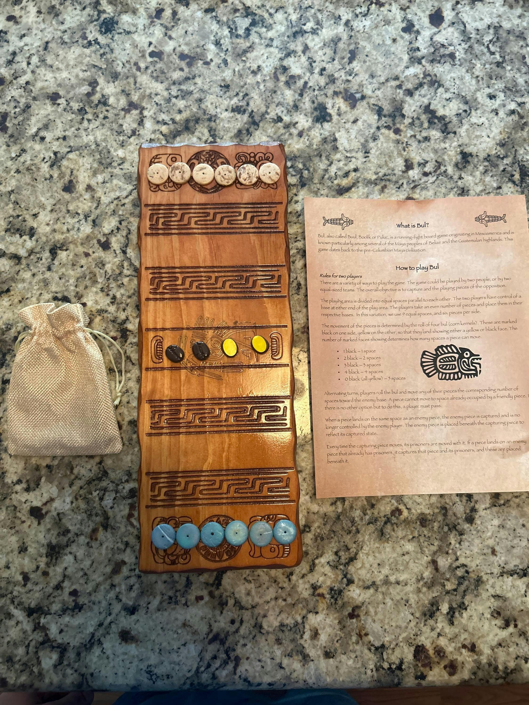 A little about the game. Puluc, also known as Bul, is an ancient board game that traces its origins to the Mayan civilization. The game is played on a rectangular grid board with two opposing teams. Each player has a set of pieces or markers that they aim to move across the board in a strategic manner. The objective of Puluc is to capture the opponent's markers or reach a designated position on the board. The game involves tactical planning, decision-making, and anticipation of the opponent's moves. Puluc not only provides entertainment but also offers insights into the Mayan culture and their approach to gaming and competition. Today, it continues to be played and enjoyed by people who appreciate the historical significance and intellectual challenge it presents.